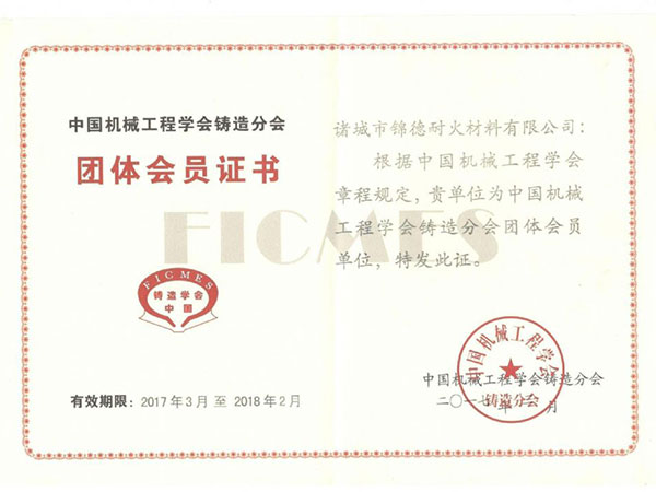 2017年3月份,諸城市錦德耐火材料有限公司成功加入中國機械工程學會鑄造分會。成為中國機械工程學會鑄造分會的會員,與各個同行業公司探討知識并共同進步。中國機械工